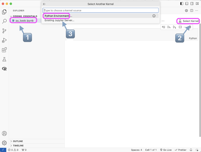 Finally is the last step before actually coding: create a new Jupyter Notebook with your preferable file name and .ipynb extension, then click “select kernal,” and then select a Python environment. If this is the first time for you to use python, then there will be only one global environment here. Select that, and we are ready to start!